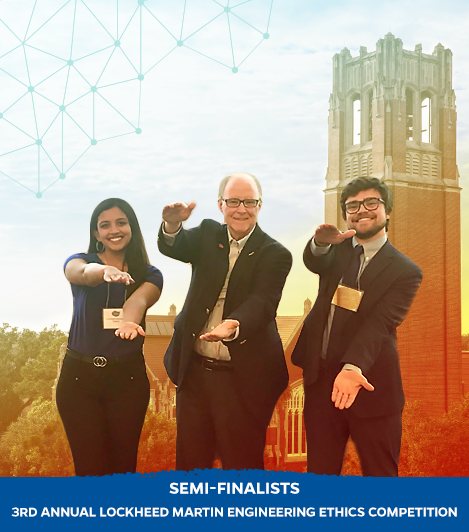 On February 27-28, 2020, Gouthami Gadamsetty (BS ISE, spring 2021) and Gantt Meredith (BS BME, spring 2021) competed fiercely and professionally with 30 other teams from top colleges around the nation. The competition, held at the Lockheed Martin Center for Leadership Excellence in Bethesda, Maryland, involved tense, timed rounds of presentations about an engineering ethics case study scenario prepared by Lockheed Martin engineers. When the dust settled, the Gator engineering team was selected as one of the top six teams to proceed to the semi-final round of the competition.