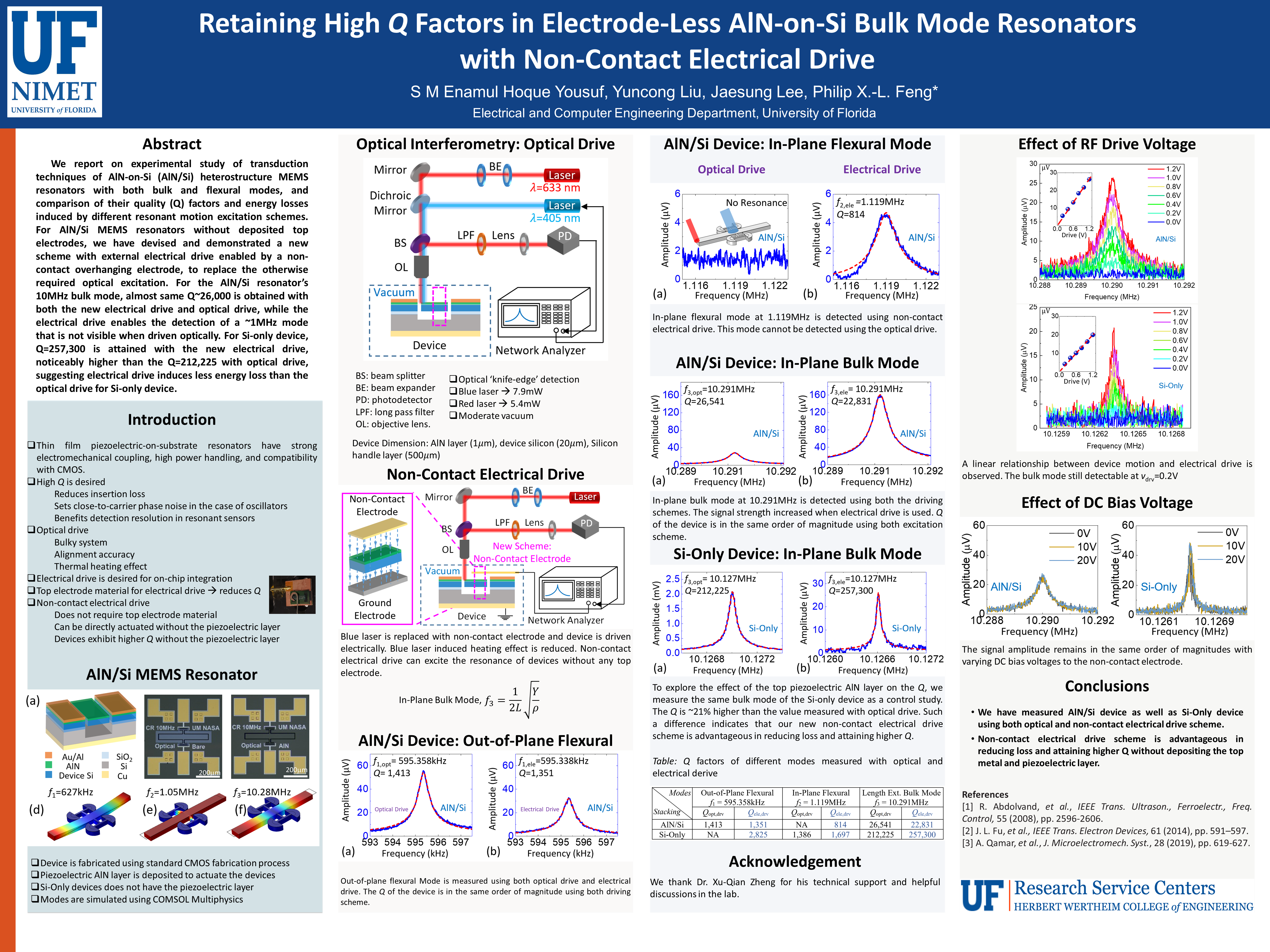 This poster reports on experimental study of transduction techniques of AlN-on-Si (AlN/Si) heterostructure MEMS resonators with both bulk and flexural modes, and comparison of their quality (Q) factors and energy losses induced by different resonant motion excitation schemes. For AlN/Si MEMS resonators without deposited top electrodes, we have devised and demonstrated a new scheme with external electrical drive enabled by a non-contact overhanging electrode, to replace the otherwise required optical excitation. For the AlN/Si resonator’s 10MHz bulk mode, almost same Q~26,000 is obtained with both the new electrical drive and optical drive, while the electrical drive enables the detection of a ~1MHz mode that is not visible when driven optically. For Si-only device, Q=257,300 is attained with the new electrical drive, noticeably higher than the Q=212,225 with optical drive, suggesting electrical drive induces less energy loss than the optical drive for Si-only device.